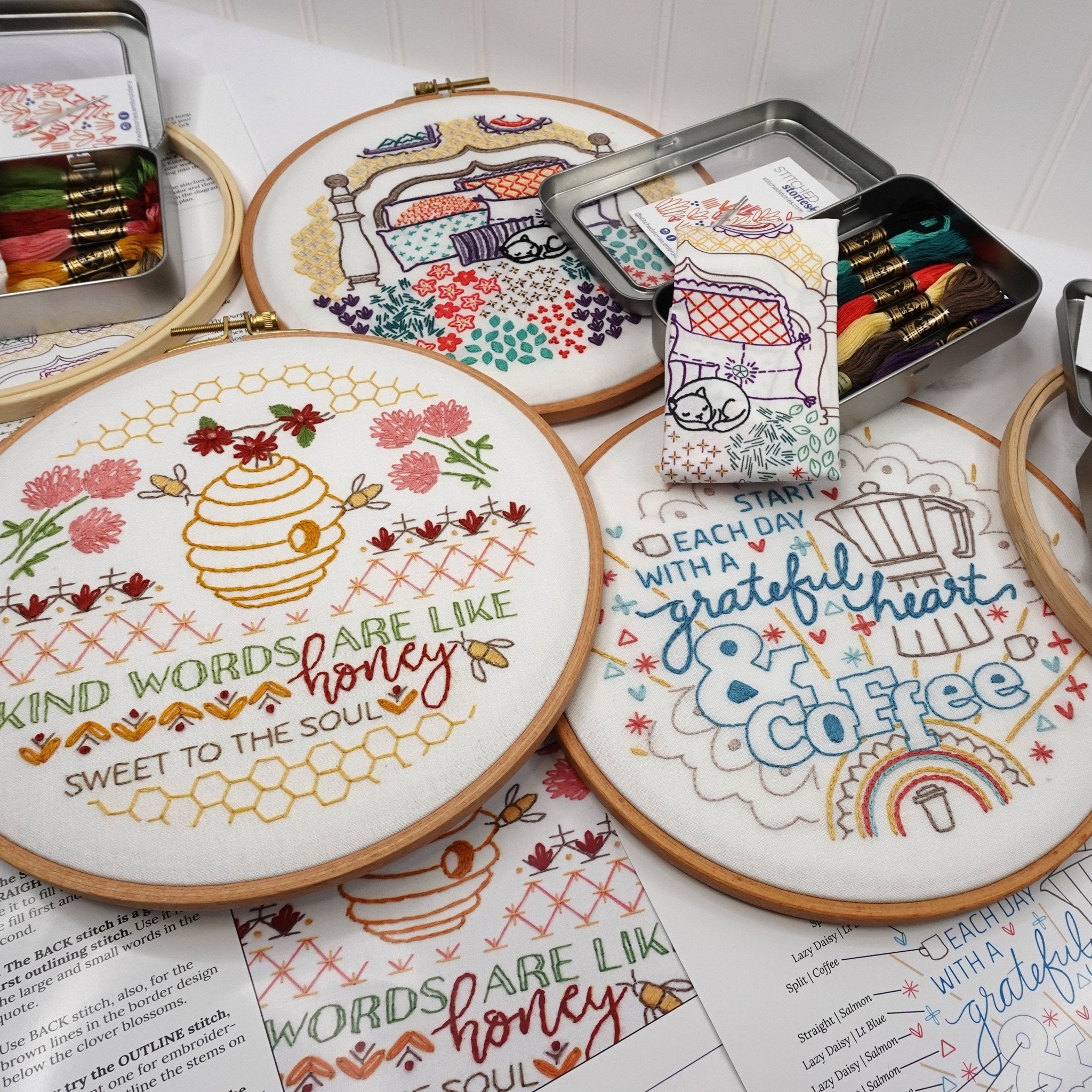 Embroidery that celebrates homey comforts: morning coffee, kind words, and slow napping afternoons. Perfect for a kitchen nook, a thoughtful gift, and cozy handmade touches.