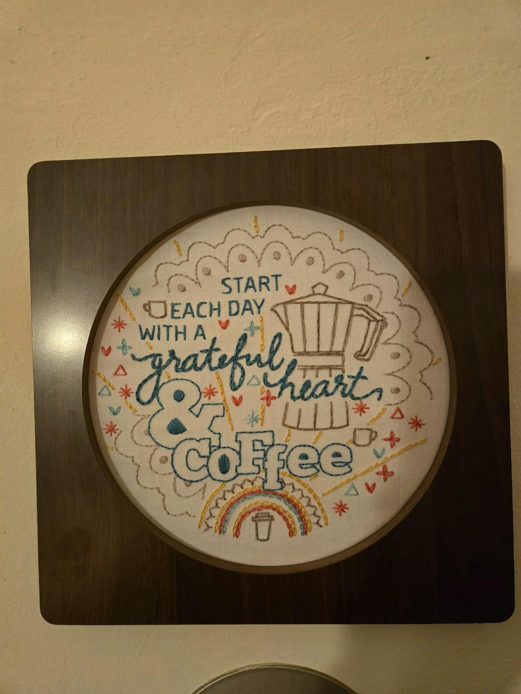 Start with Coffee is an easy and fun kit to embroider for any one who loves a cup of joe and the beginning of a new day. You'll render the featured saying with three different stitches to go with the three different font treatments. Other details include rays of a sunrise weaving through the motifs along with a partial doily edging that evokes the sense of a coffee filter. It's an engaging project with a variety of traditional hand embroidery stitches.