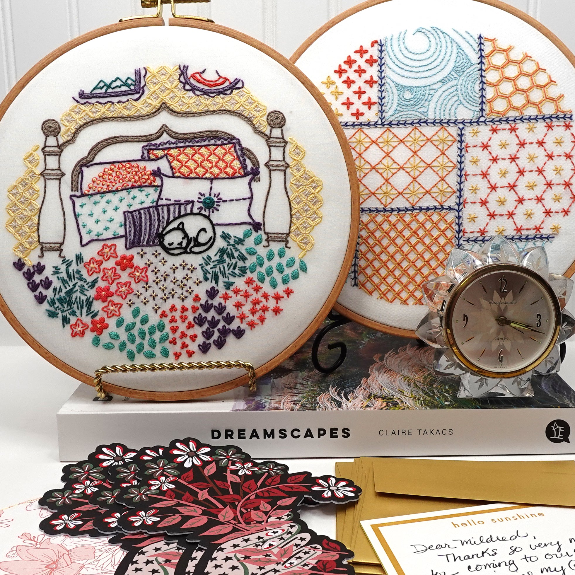 Each of these is a complete Stitched Stories kit—printed design, curated floss, hoop, needles, and my illustrated guide. Everything you need comes straight from my studio so you can begin stitching as soon as it arrives.