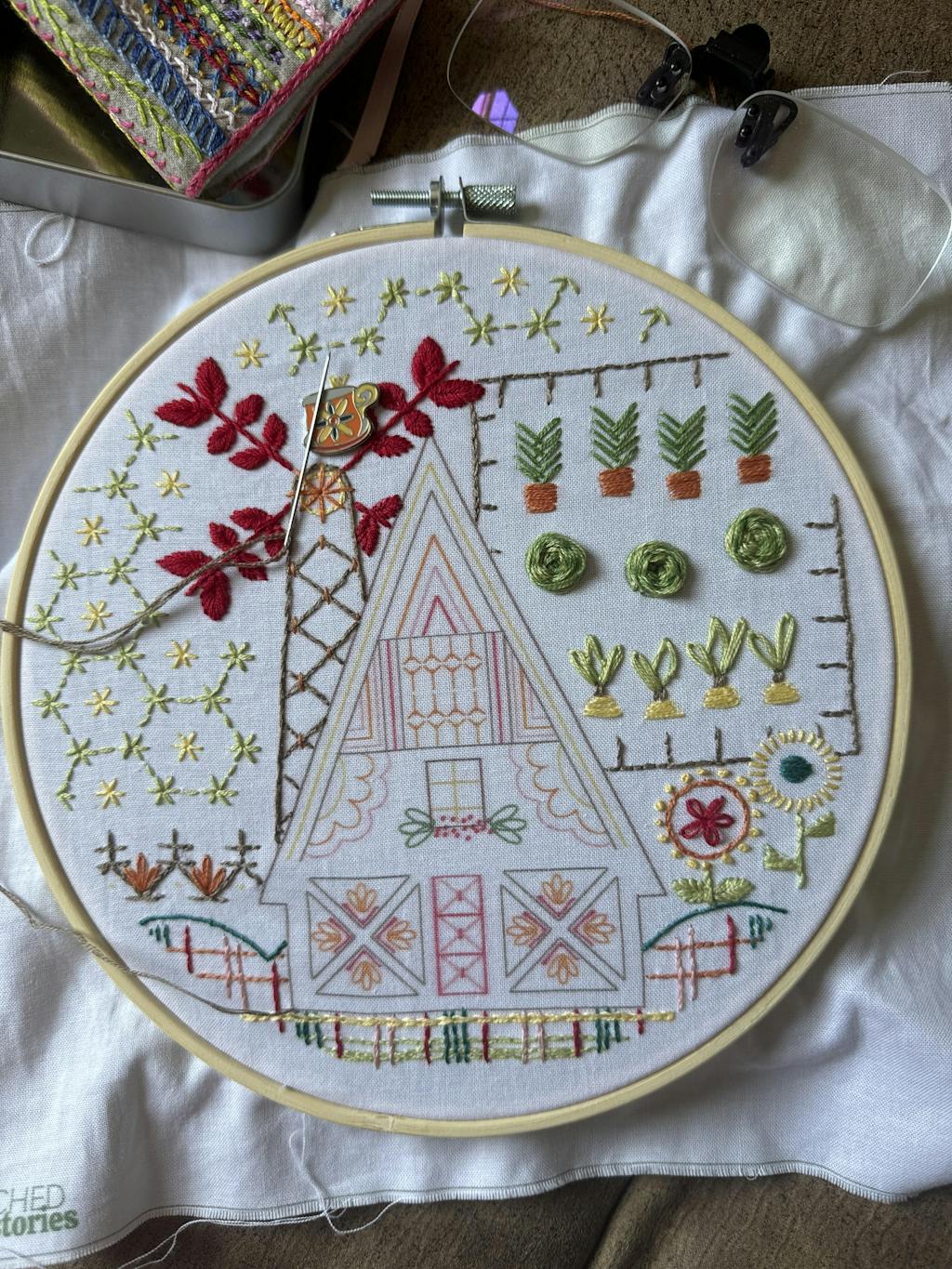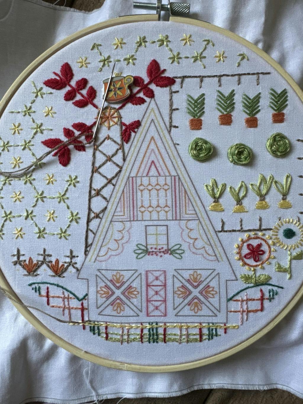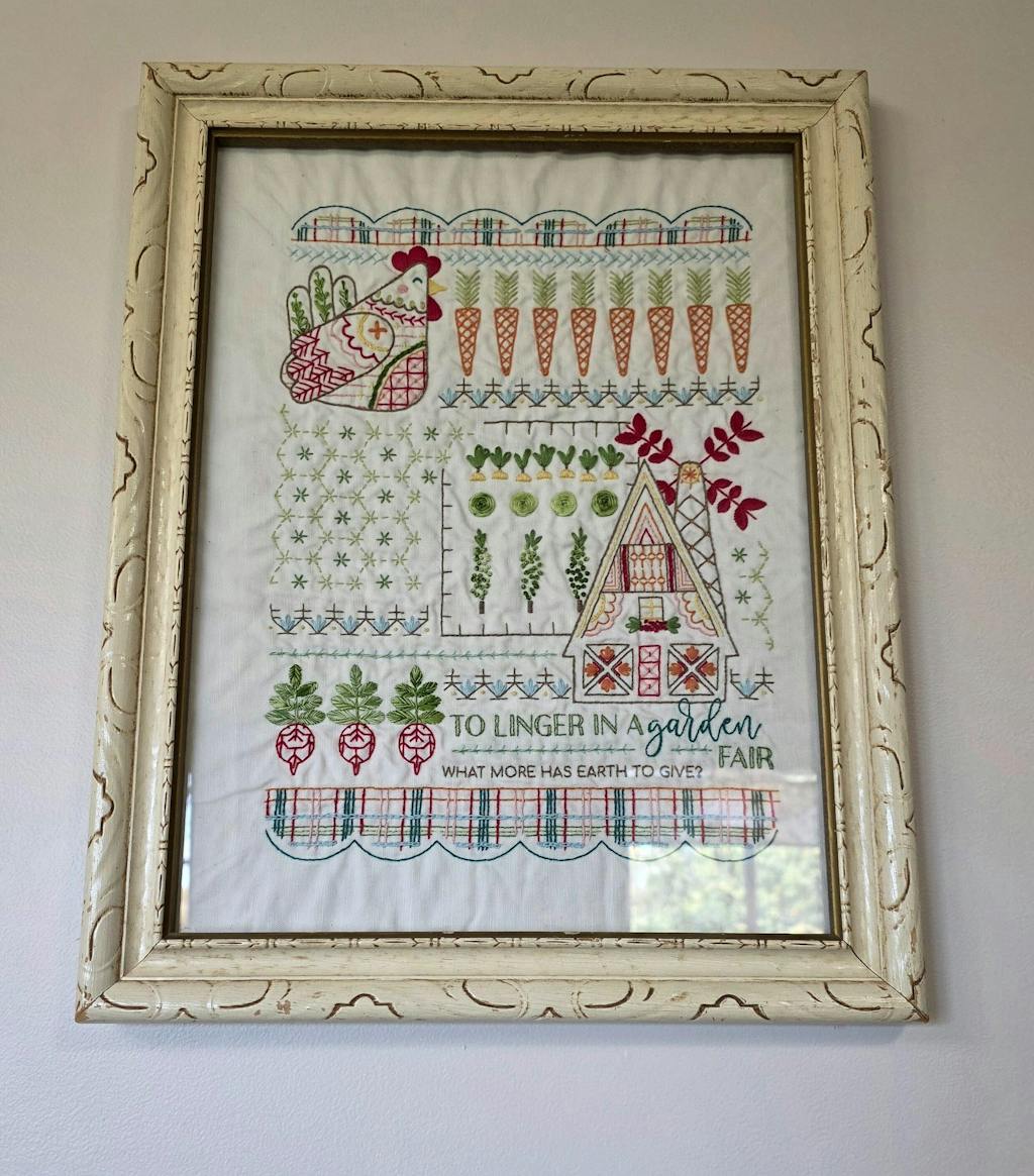 Embroider a classic sampler with kitchen garden and country cottage motifs using freestyle hand embroidery stitches. You'll stitch carrots and hen, beets and garden bed, cottage, quote and repeating borders.