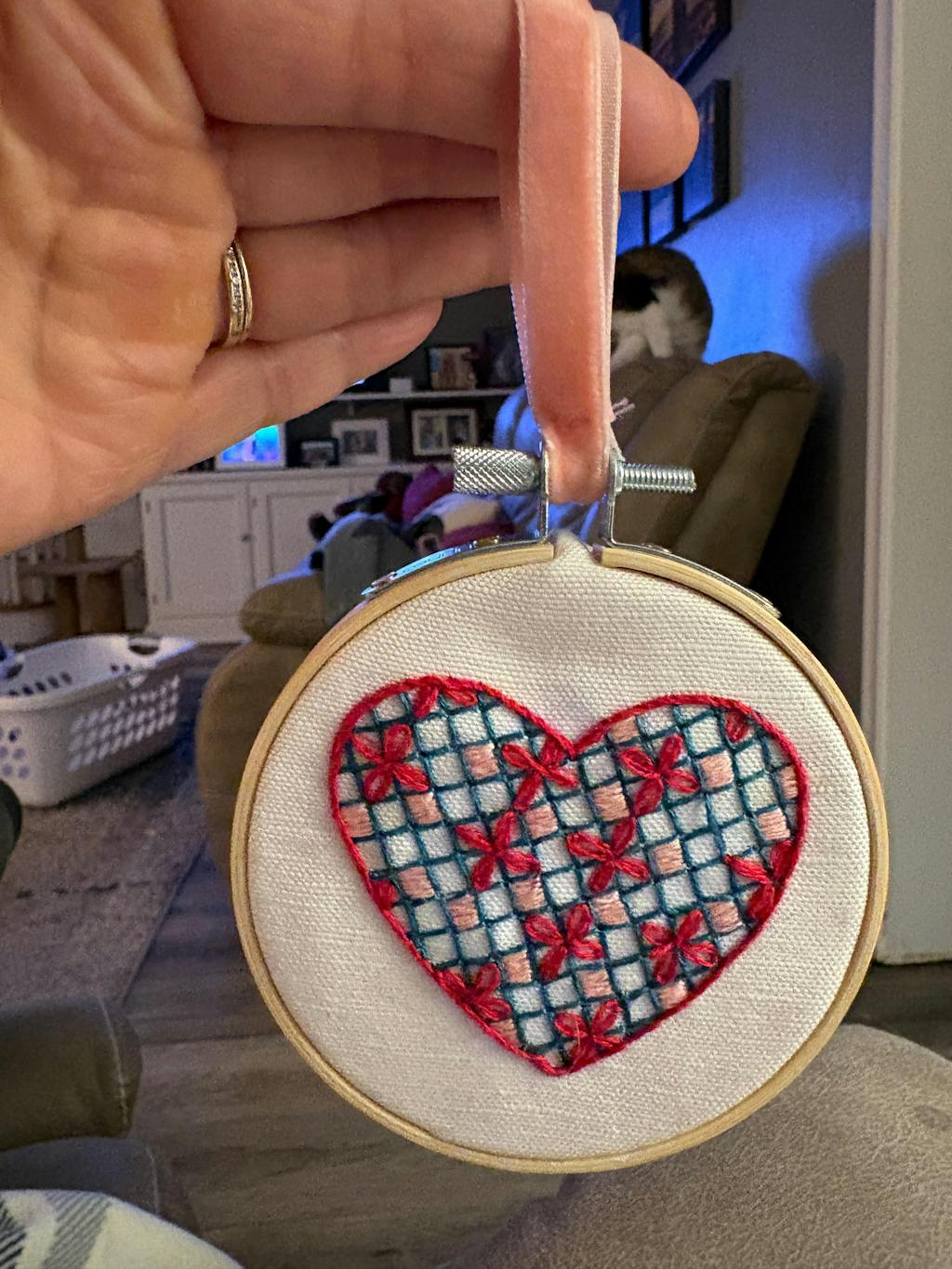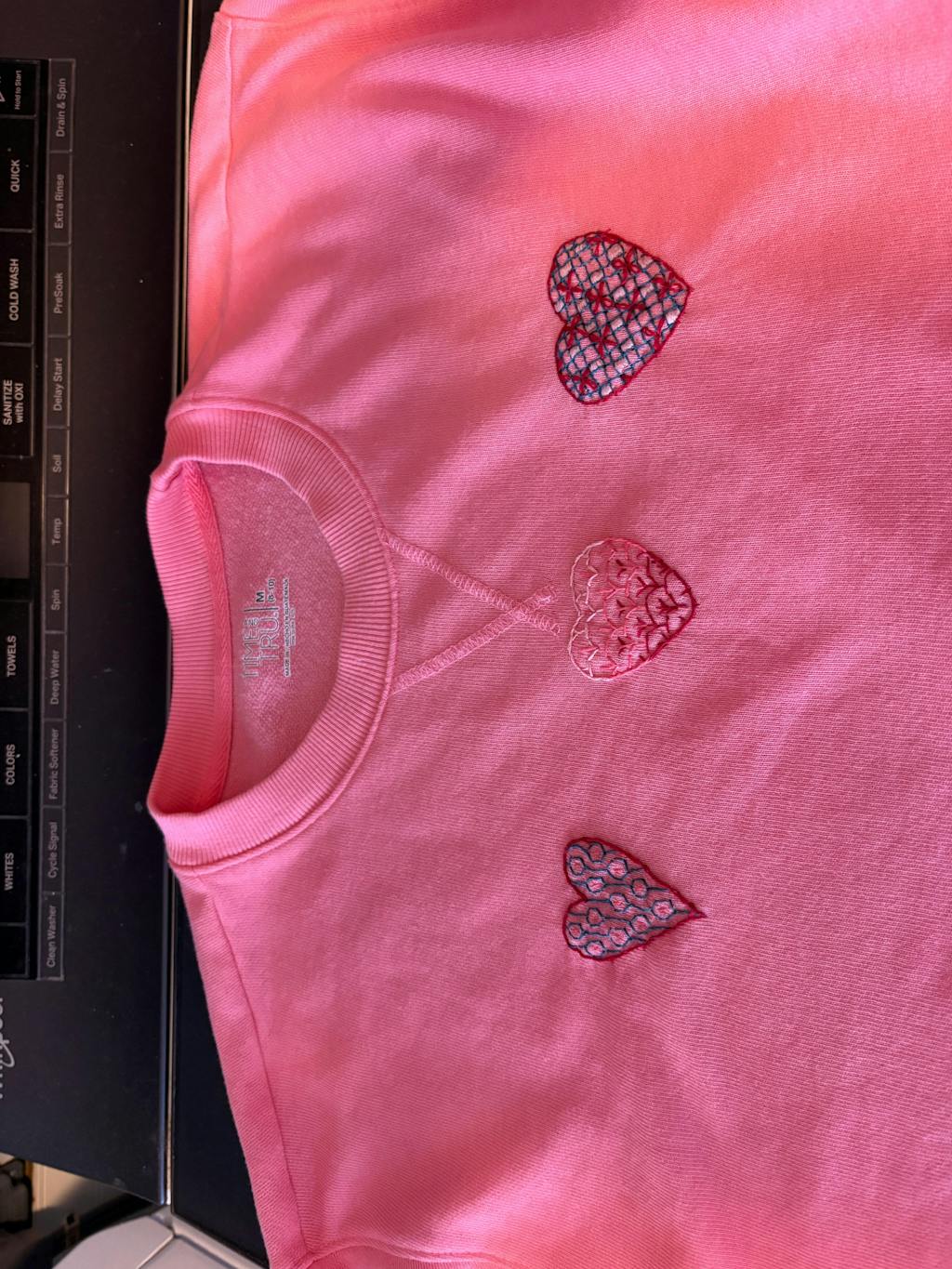 The heart minis kit was fun and easy to use. I appreciate the high quality of the thread and storage tin. I traced the hearts onto embroidery paper to embroider a Valentine’s sweatshirt in addition to making the ornaments.